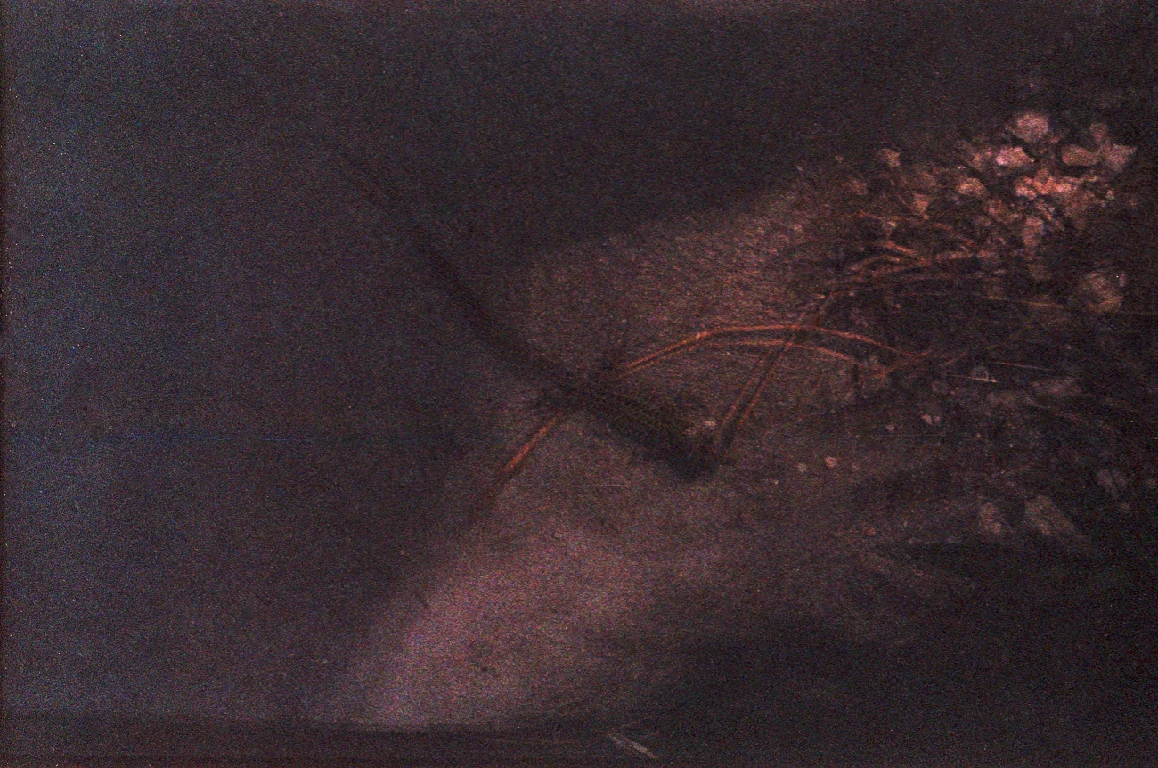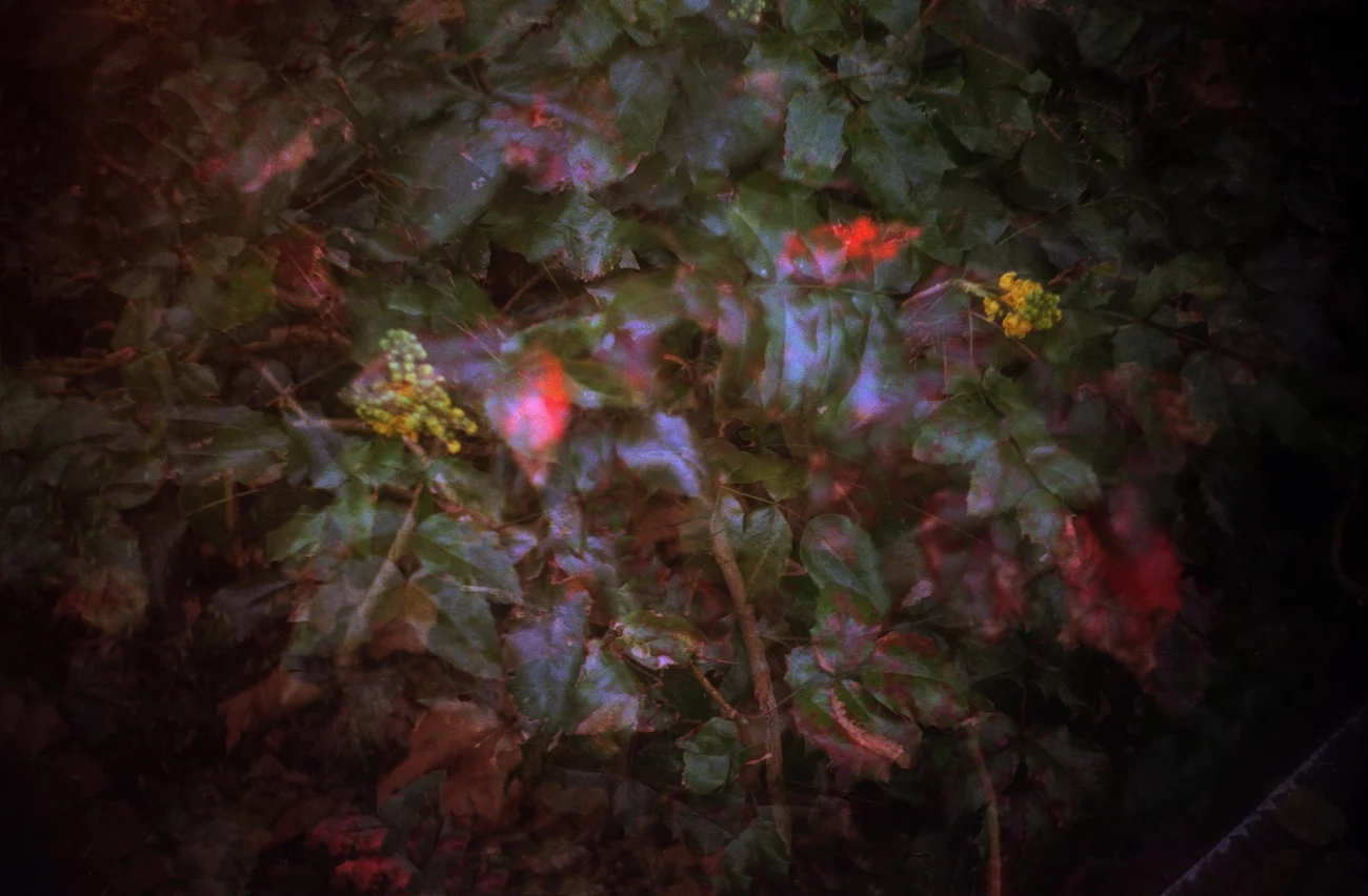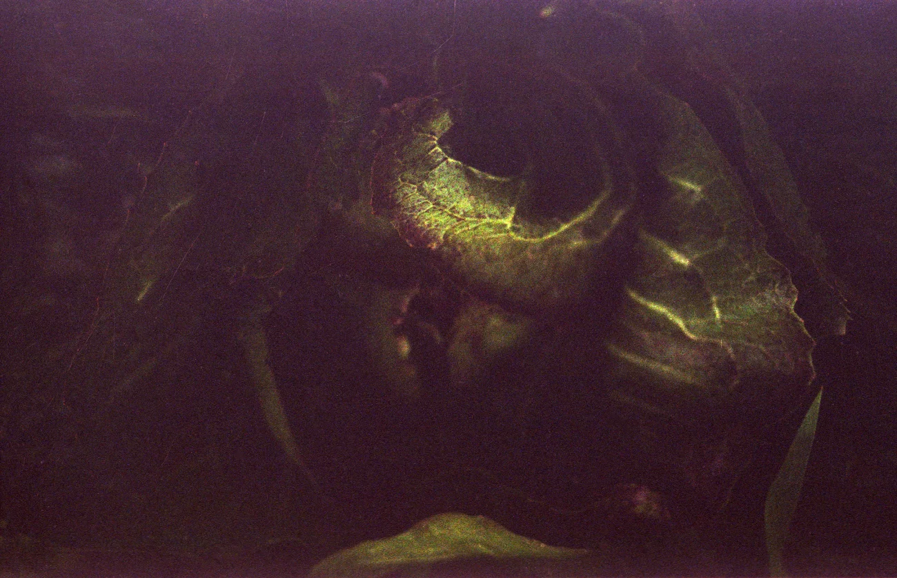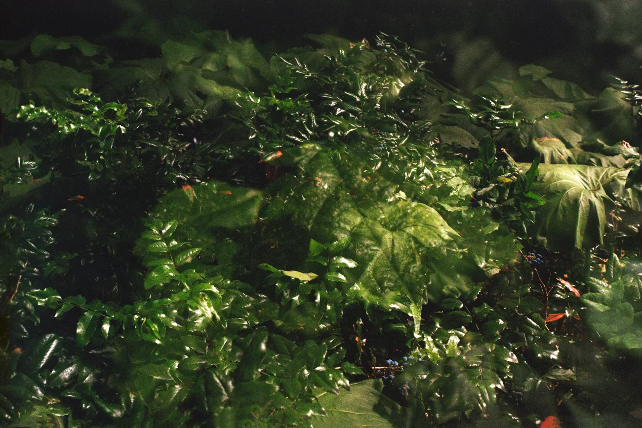 The photographs are taken during the day, yet captured in a way that allows only minimal light to enter. Through this deliberate manipulation of analog film, large parts of the image remain concealed in darkness. What becomes visible are only fragments: plants, surfaces, structures, while everything else disappears, remains hidden, and takes on an almost threatening quality.