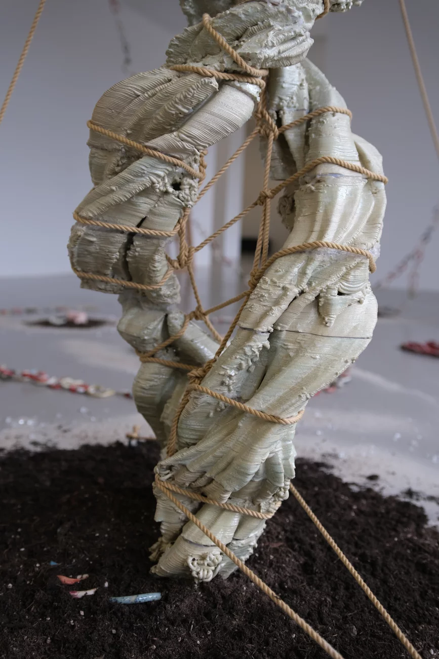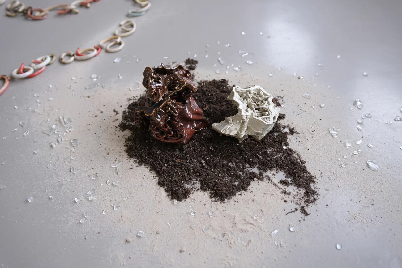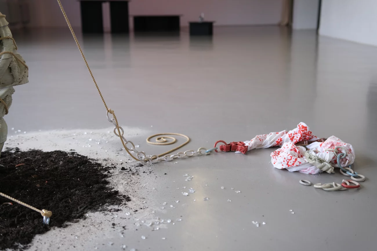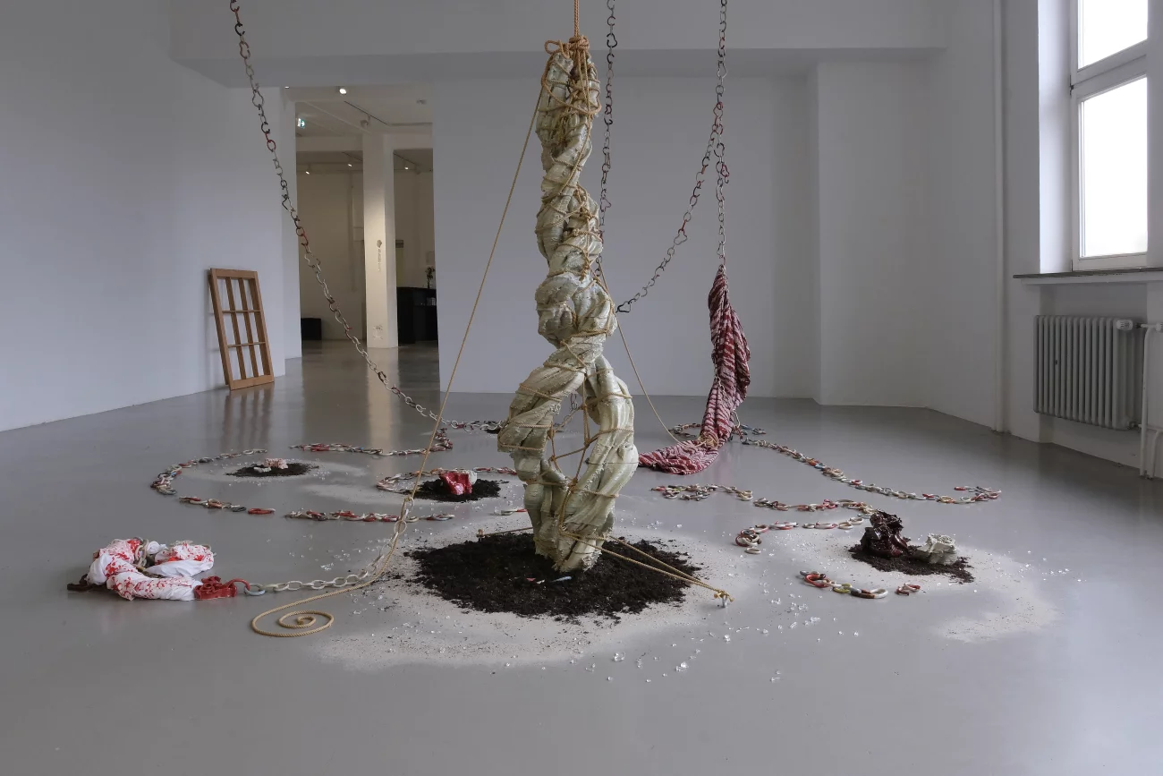 In the installation The Coldest Sound, the viewer enters a place that draws on the structural principles of nature, embracing and continuing them. They encounter chains hanging from the ceiling and spread throughout the room. Fabrics printed with patterns sprawl out like bodies. Piles of earth settle on the floor like sediments, accumulating first into sand and then into glass. Rising in the midst of this landscape and growing out of the same earth is a ceramic structure. Using a machine printing process, Khatskevich shapes clay—an ancient and natural raw material—into an artificial reproduction of one of the most fundamental biological forms: the double helix. The surface of the sculpture becomes a technical facade, reflecting the human appropriation of nature. While the free-standing spiral is trussed and held by ropes, smaller, individual pieces can be found around it like building blocks.