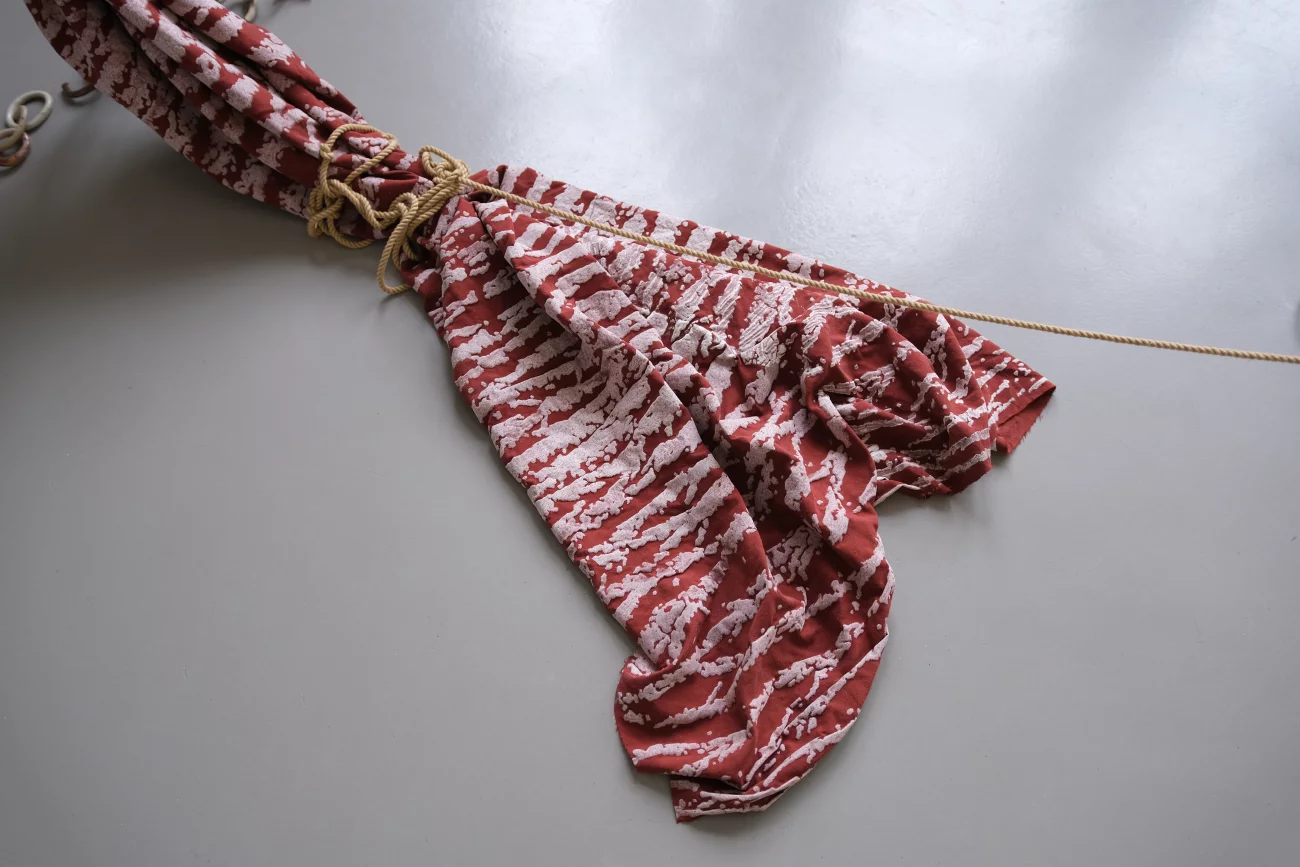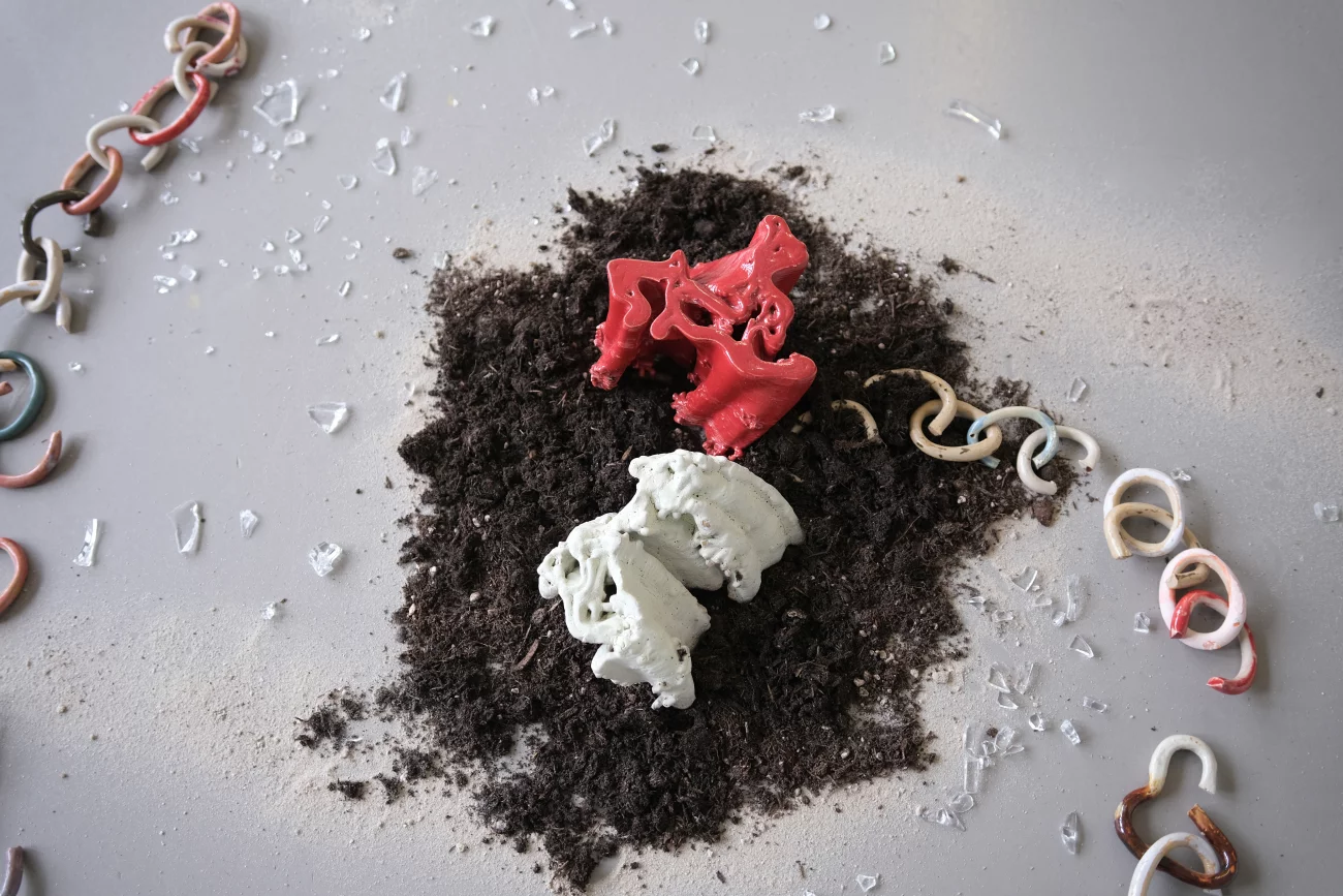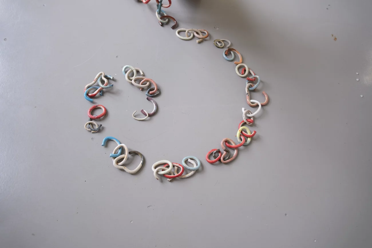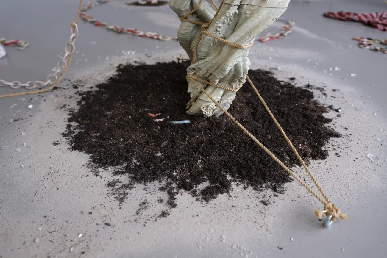 In the installation The Coldest Sound, the viewer enters a place that draws on the structural principles of nature, embracing and continuing them. They encounter chains hanging from the ceiling and spread throughout the room. Fabrics printed with patterns sprawl out like bodies. Piles of earth settle on the floor like sediments, accumulating first into sand and then into glass. Rising in the midst of this landscape and growing out of the same earth is a ceramic structure. Using a machine printing process, Khatskevich shapes clay—an ancient and natural raw material—into an artificial reproduction of one of the most fundamental biological forms: the double helix. The surface of the sculpture becomes a technical facade, reflecting the human appropriation of nature. While the free-standing spiral is trussed and held by ropes, smaller, individual pieces can be found around it like building blocks.