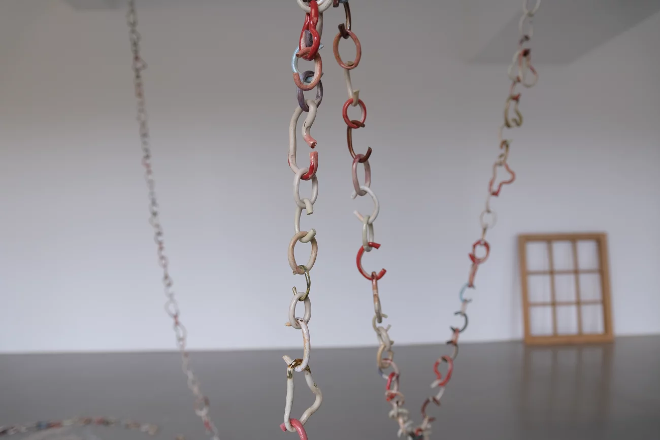 The motif of chains and linkages runs through the installation, creating cross-connections through material, visual, and processual combinations. Individual links unite to form a chain—multiple components create a comprehensive structure. Khatskevich’s work is more than the sum of its individual parts. It cannot be understood as a fixed point, but must be conceived of as an ongoing process in which the human and the natural interact with each other—continuous outpourings, progression, and reconciliation.