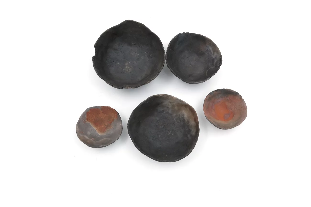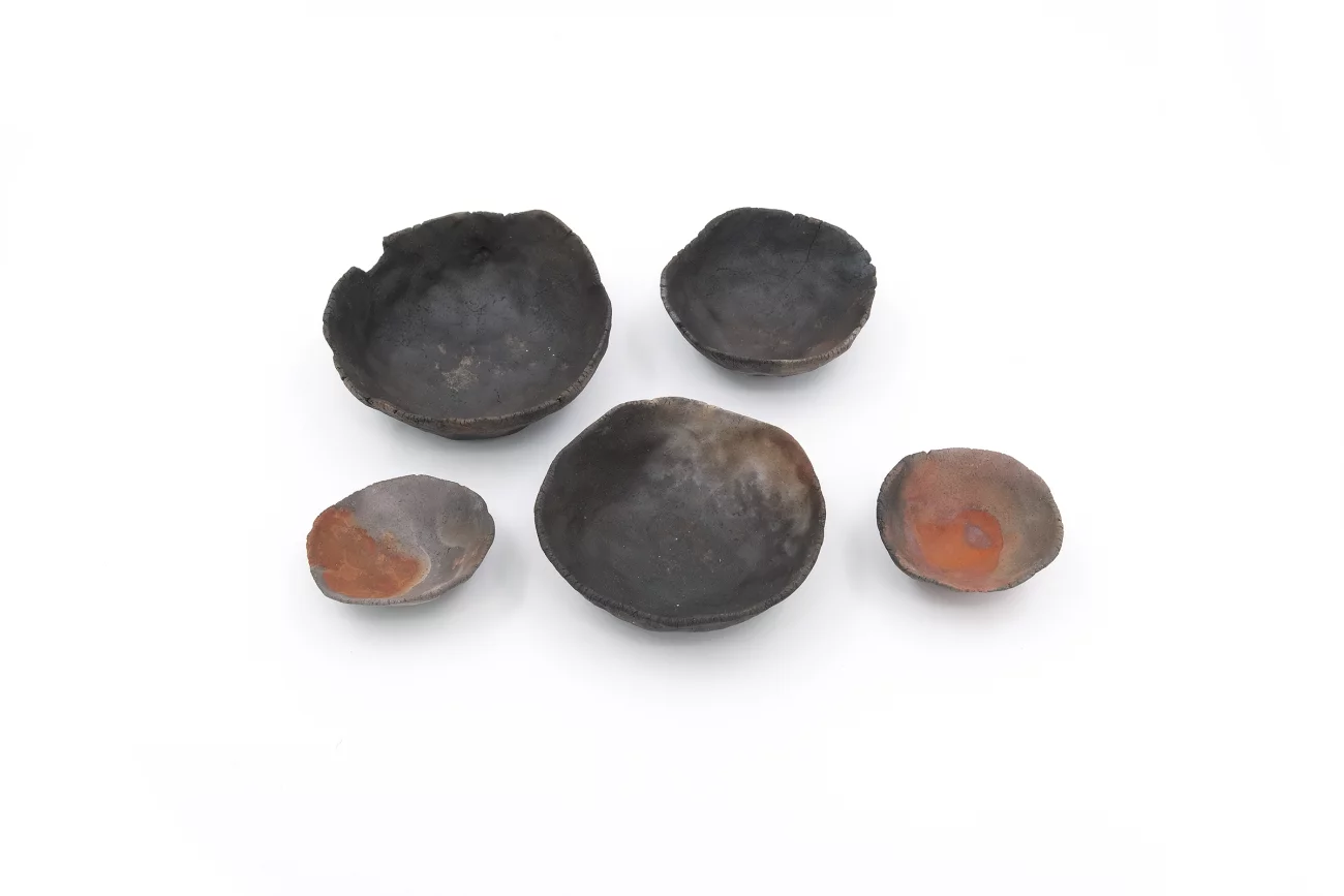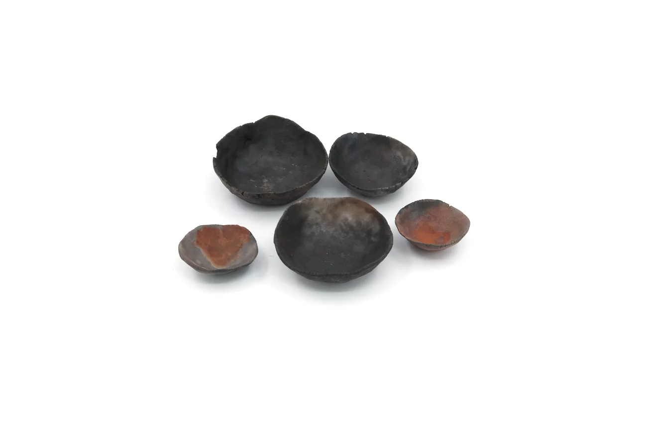 Set of 5, hand-built, earthenware, smoke firing, unglazed, 3×8cm | 3.5× 9cm | 3×7cm | 2×5.5cm | 2×5cm