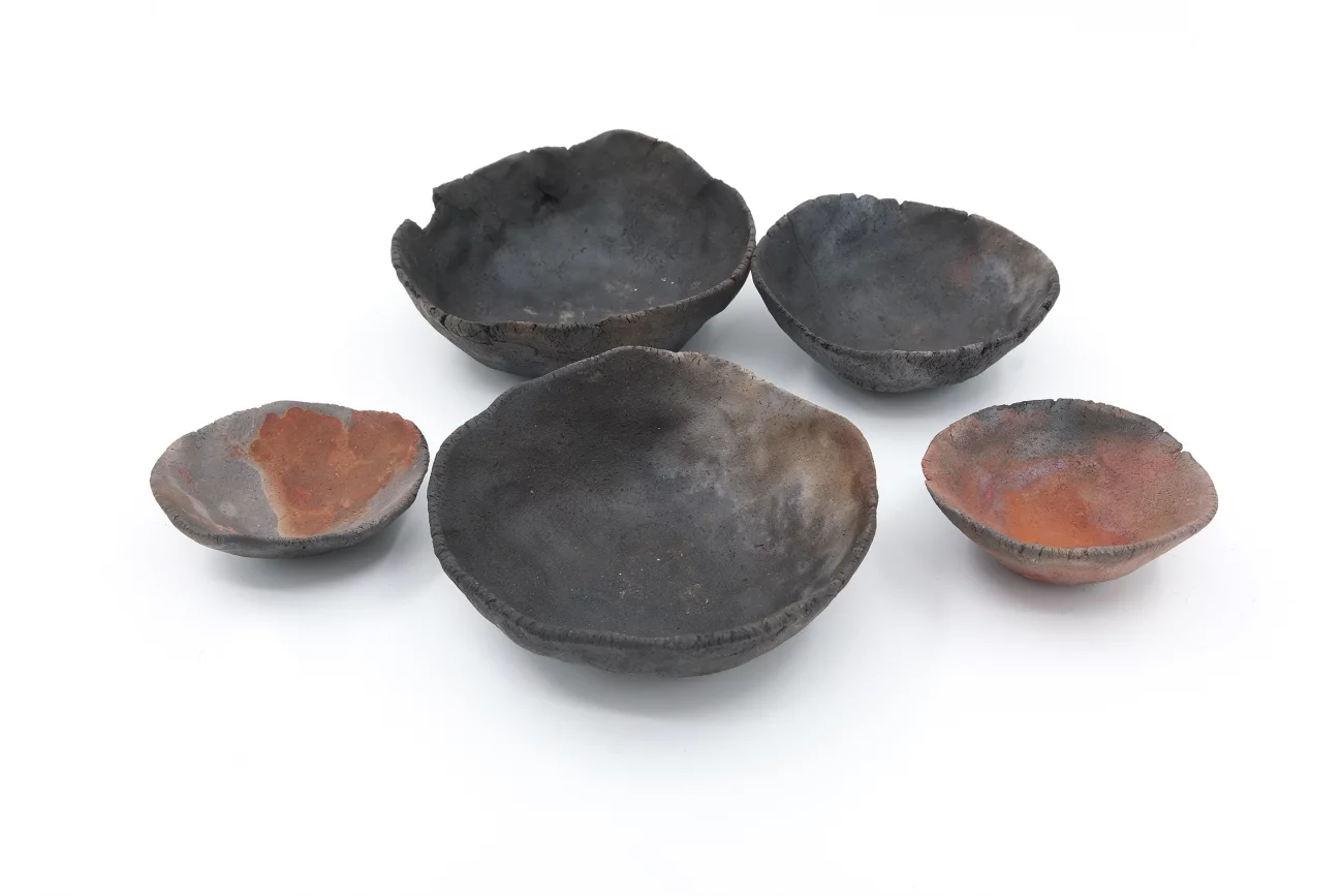 Set of 5, hand-built, earthenware, smoke firing, unglazed, 3×8cm | 3.5× 9cm | 3×7cm | 2×5.5cm | 2×5cm